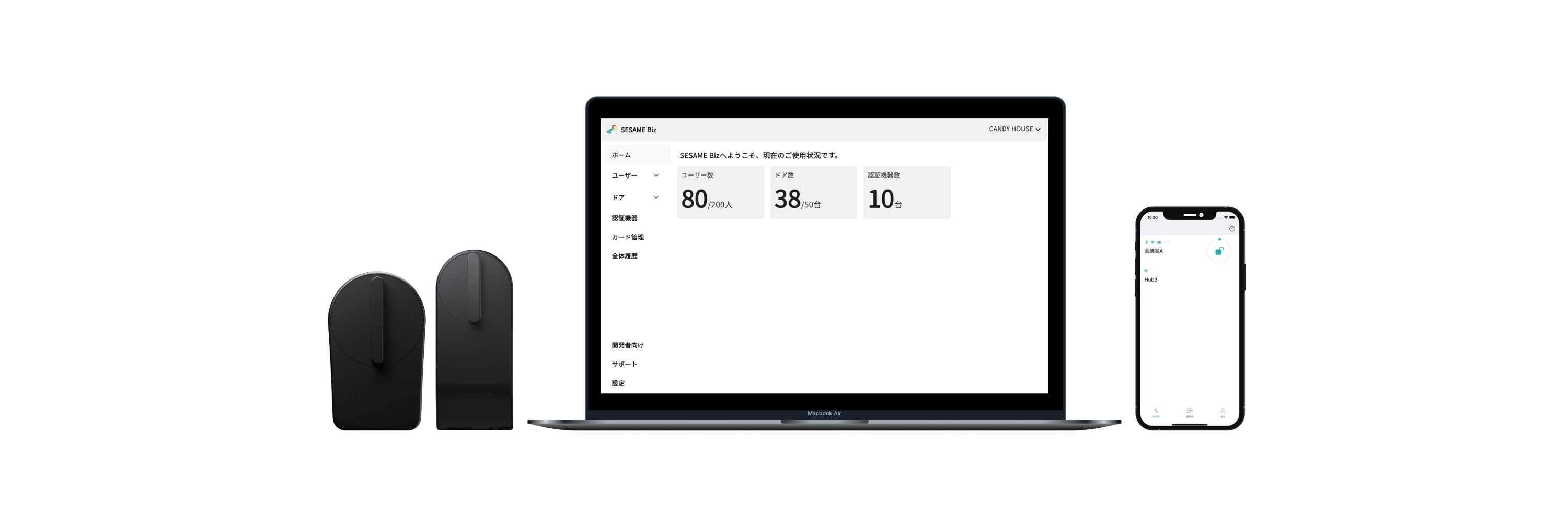 ※認証機器/カード管理ページの利用および、Biz上からのドアデバイスの施解錠のご利用は合わせてHub3もご用意いただく必要がございます。